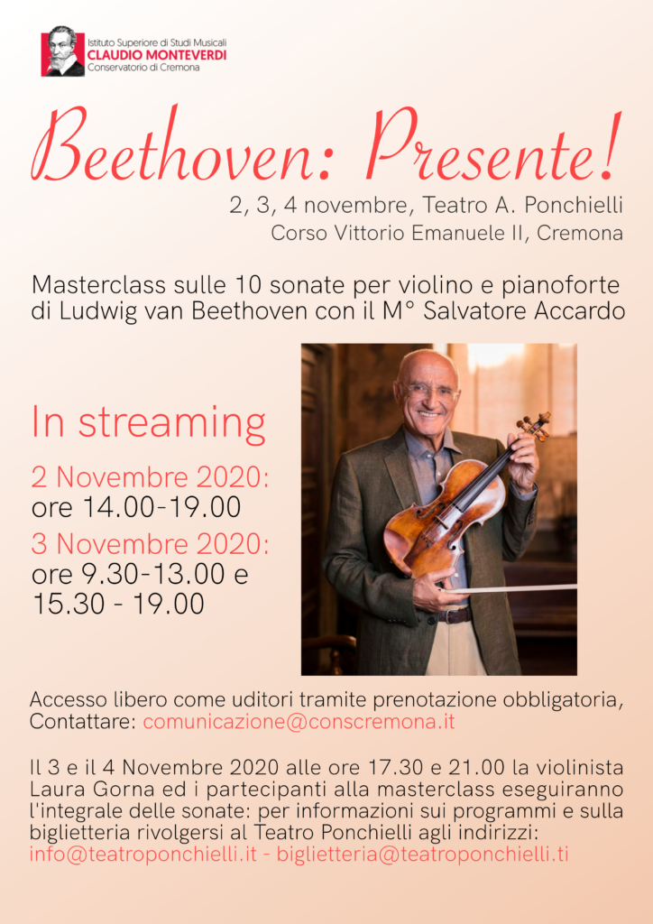 Questo momento di formazione fa parte del più ampio progetto “Beethoven: Presente!”, che prevede una serie di incontri rivolti ai musicisti del Conservatorio Monteverdi con la prof.ssa Laura Gorna, docente titolare della classe di violino al Conservatorio di Cremona.