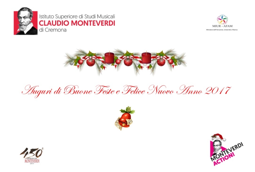 L’Istituto Superiore di Studi Musicali ‘Claudio Monteverdi’ osserverà la chiusura in occasione delle festività natalizie dal 24 Dicembre 2016 all’8 Gennaio 2017 compresi. Le lezioni e le attività riprenderanno dal giorno 9 gennaio 2017.