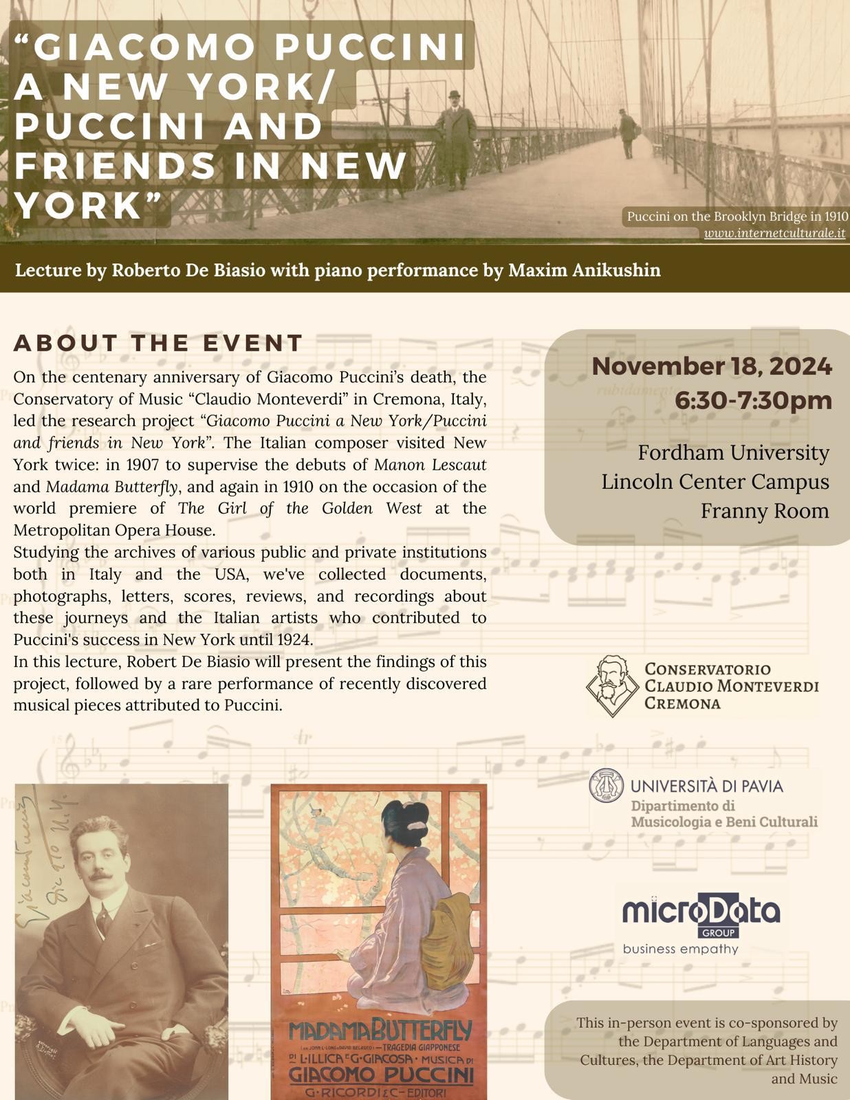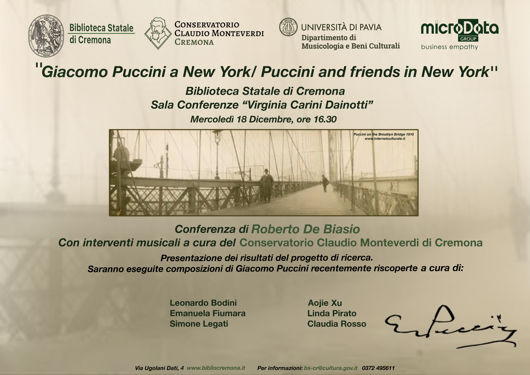Il progetto di ricerca Giacomo Puccini a New York / Puccini and friends in New York, realizzato in collaborazione con il Dipartimento di Musicologia e Beni Culturali dell’Università di Pavia (sede di Cremona) e con la Fordham University di New York, ha inteso indagare e rivalutare gli artisti italiani che contribuirono significativamente al successo delle opere del compositore lucchese a New York fino al 1924.